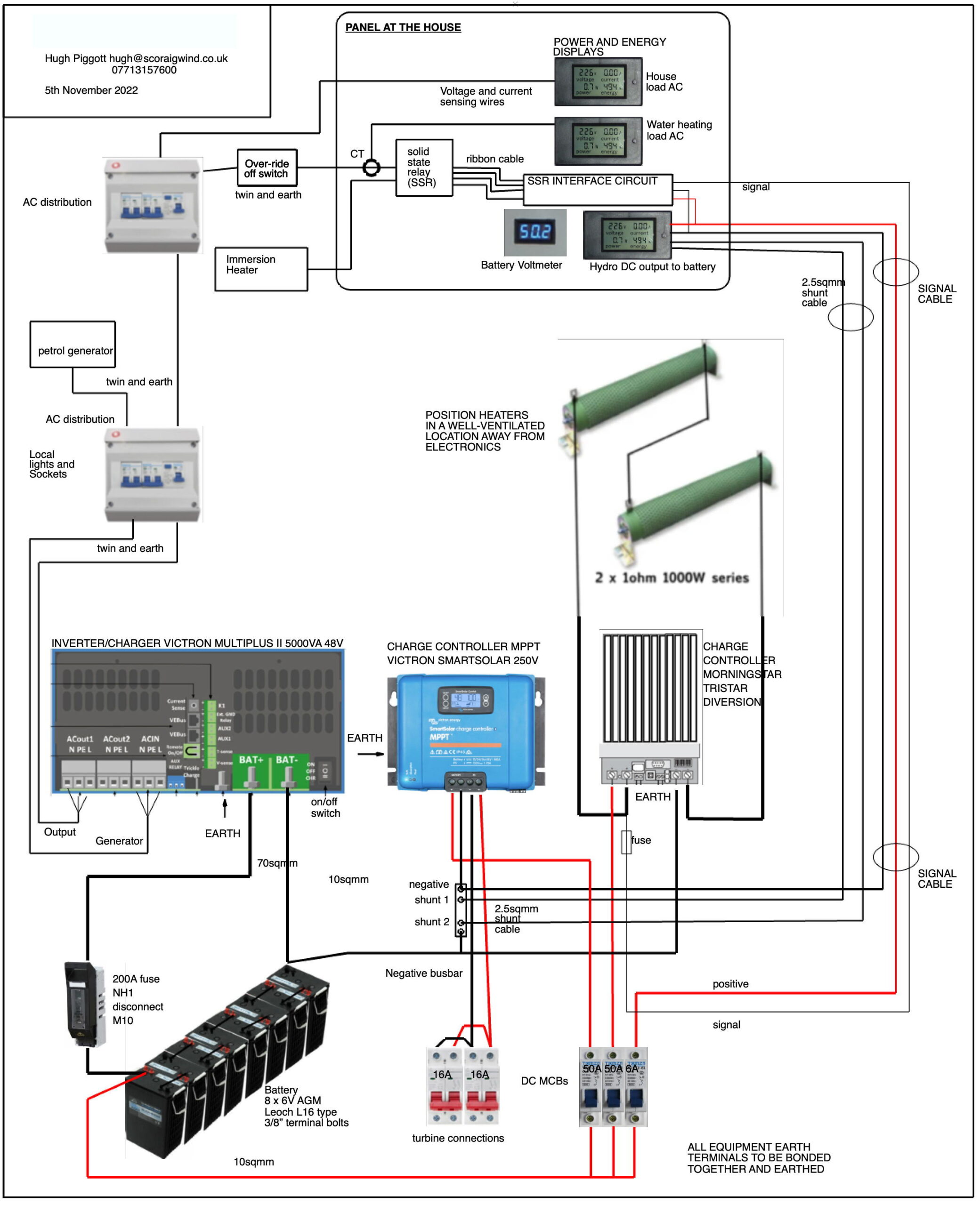 The electrical system includes an MPPT controller for the hydro input and a diversion load controller to keep the turbines on load when the battery is full.